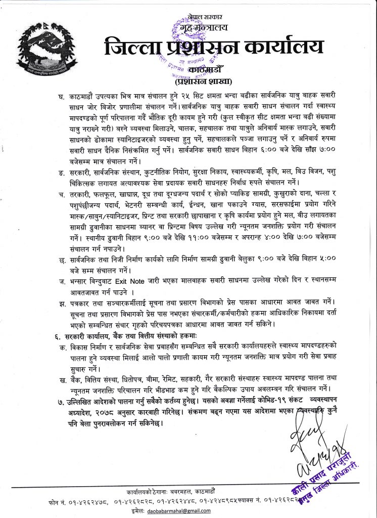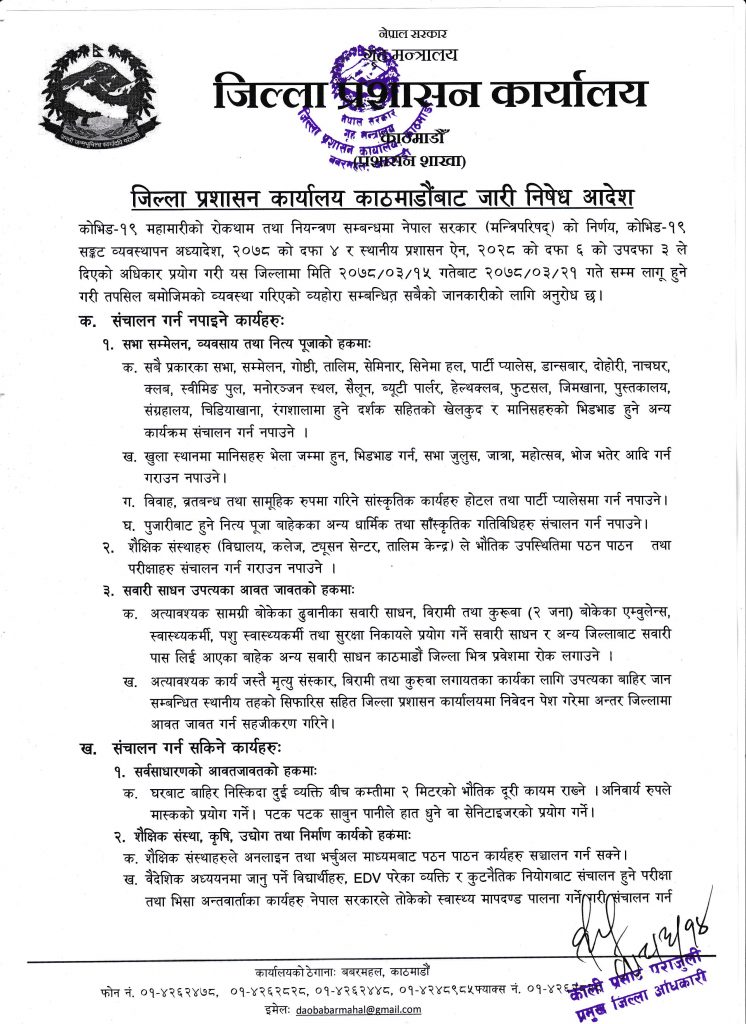 काठमाडौं, १४ असार । काठमाडौं उपत्यकामा फेरि एकसाता निषेधाज्ञा थपिएको छ । तर सार्वजनिक यातयातहरु भने मापदण्डका आधारमा सञ्चालन हुने भएका छन् ।