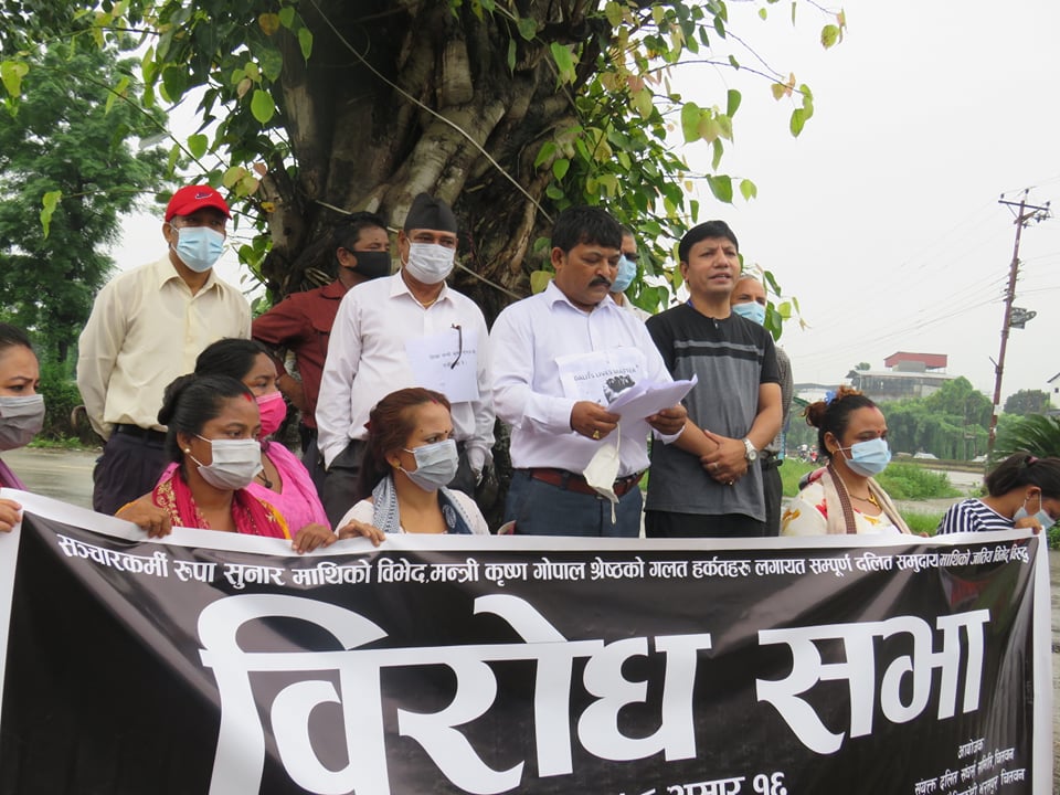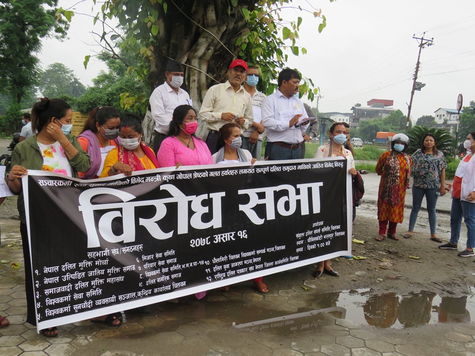 नेपाल दलित मुक्ति मोर्चा, नेपाल उत्पीडित जातीय मुक्ति समाज, समाजवादी दलित मुक्ति महासंघ, विश्वकर्मा सेवा समिति, विश्वकर्मा सुनचाँदी व्यवसायी सञ्जाल केन्द्रीय कार्यालय चितवन, मिजार सेवा समिति, परियार सेवा समाज, विश्वकर्मा सेवा समिति भरतपुर १४, दलित नागरिक समाज, धौलागिरी चितवन विश्वकर्मा सम्पर्क मञ्च चितवन, दलित युवा जागरण मञ्च नेपाल, राष्ट्रिय दलित पत्रकार संघ नेपाल जिल्ला कार्यसमिति चितवन आवद्ध संयुक्त दलित संघर्ष समिति चितवनले आज विरोध सभा गरेको थियो।