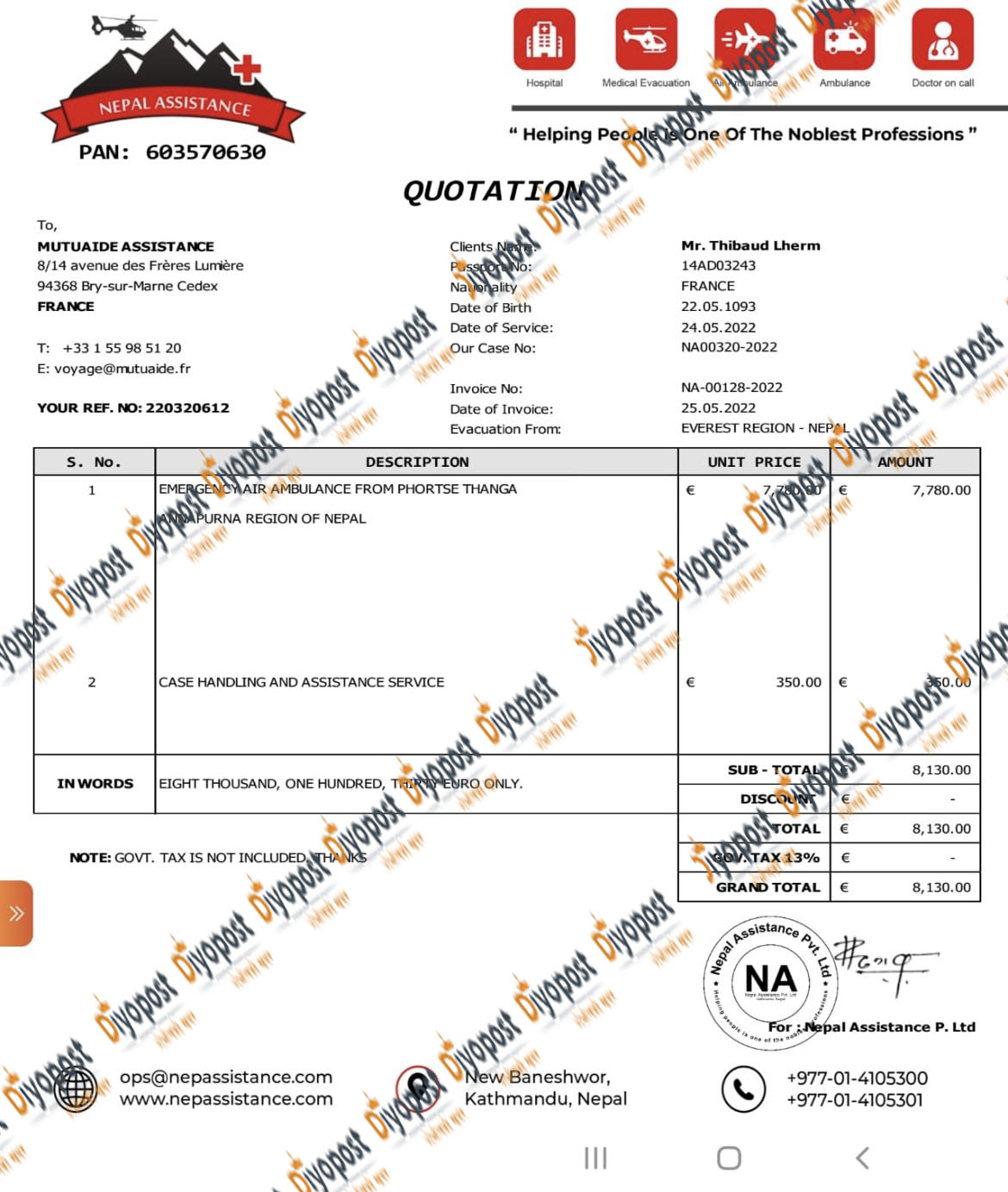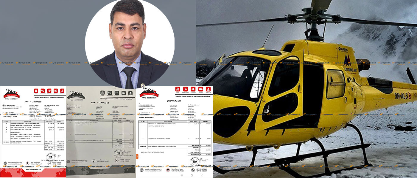 दियोपोस्टले लामो अनुसन्धानबाट प्राप्त गरेको कागजात अनुसार ब्राजिलका नागरिक फिलिप डियस पाइभा नाम गरेका नागरिकलाई सन् २०२२ मे ४ मा हेलिकोप्टरबाट उद्दार गरिएको भन्दै बिल बनाइएको छ । मे ६ मा उनको नाममा जारी भएको बिल अनुसार उनलाई सगरमाथा क्षेत्रबाट उद्दार गरिएको उल्लेख छ । तर, बिलमा यस्तो उल्लेख भएपनि त्यो दिन उनलाई हेलिकोप्टरमा उद्दार नै नगरिएको स्रोतको दाबी छ । सगरमाथा आधार शिविरबाट उद्दार गरिएको भनिएको उनलाई एक रात लुक्लामा होल्ड गरेर राखेको उल्लेख छ । त्यसपछि काठमाडौं स्थित एक अस्पतालमा उपचार गरिएको उल्लेख गरिएको छ । उनको उद्दारको नाममा विदेशी विमा कम्पनिबाट ११ हजार ७ सय ५४ डलर असुल गरिएको छ । जसको नेपाली विनियमय दर अनुसार साढे १४ लाख रुपैयाँ भन्दा बढी नेपाली रुपैयाँ हुन आउँछ ।
