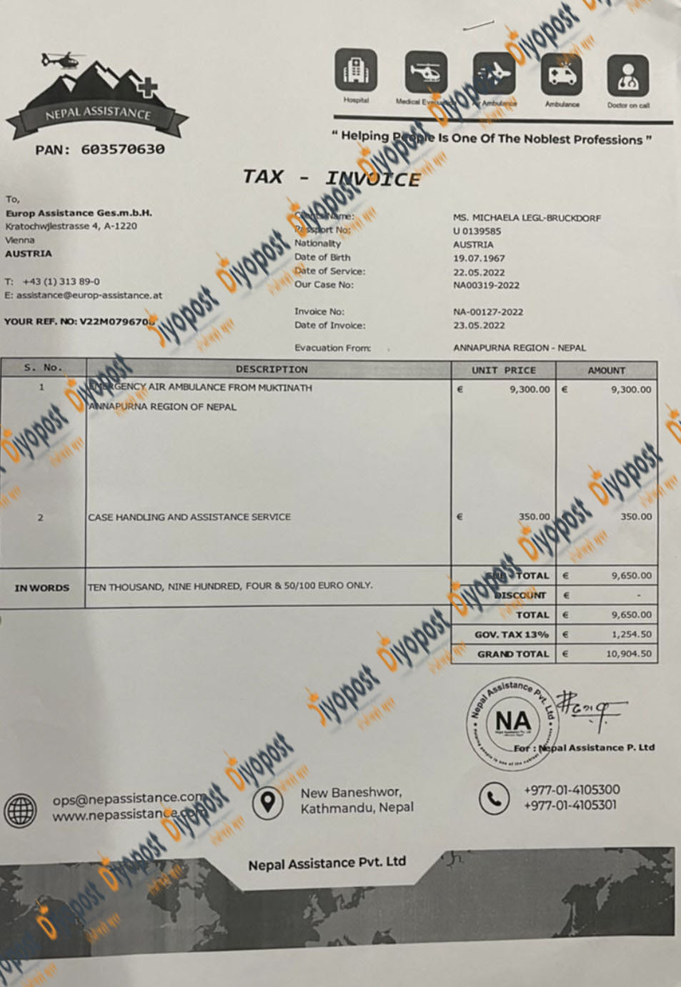 त्यस्तै अष्ट्रियाका एक नागरिकको नाममा जारी भएको अर्को बिल पनि फर्जि भएको स्रोतले जनाएको छ । मुक्तिनाथ दर्शनका लागि गएका अष्ट्रियाका माइकल लेग्ल नाम गरेका ती नागरिकले सन् २०२२ मे २२ मा हेलिकोप्टरबाट उद्दारको सेवा लिएको सोही कम्पनिद्वारा जारी बिलमा उल्लेख छ ।