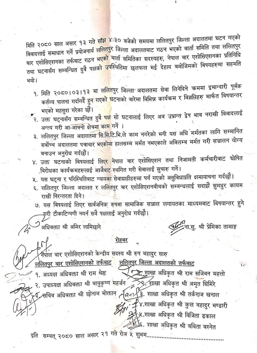 विवादलाई समाधान गर्ने प्रयोजनार्थ ललितपुर जिल्ला अदालतबाट गठन भएको वार्ता समिति तथा ललितपुर बार एशोसिएशनका तर्फबाट गठन भएको वार्ता समितिका सदस्यहरु, नेपाल बार एशोसिएशनका प्रतिनिधि तथा घटनासँग सम्बन्धित दुवै पक्षको उपस्थितिमा छलफल भइ यस्तो सहमति भएको हो।