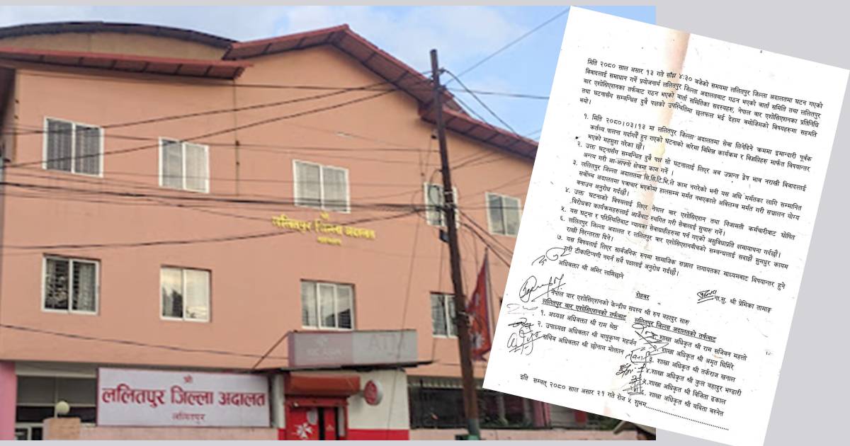ललितपुर जिल्ला अदालतमा सेवा लिने/दिने क्रममा इमान्दारीपूर्वक कर्तव्य पालना गर्दागर्दै हुन गएको घटनाको बारेमा विभिन्न कार्यक्रम र विज्ञप्तिहरुमार्फत् विषयान्तर भएको सहमतिमा भनिएको छ।