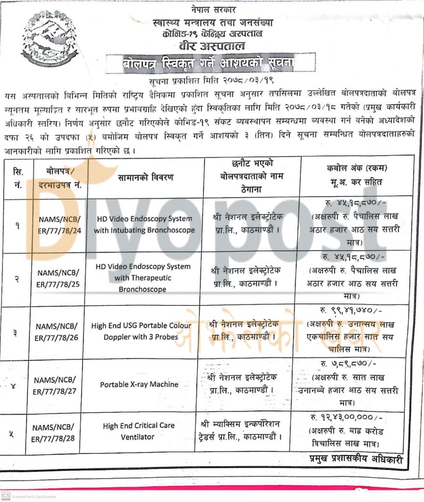 गत असार ११ गते वीर अस्पतालले १५ करोड बराबरको ठेक्का आह्वान गरेको थियो । एक्सरे मेसिन, युएसजी मेसिन लगायतको सामग्री खरिदको करिब साढे २ करोडको ठेक्का भने नेश्नल इलेक्ट्रोटेक प्रा.लीलाई दिएको छ ।