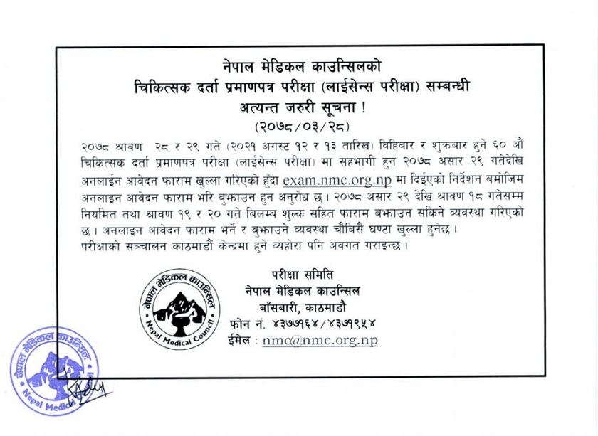 काठमाडौं, २८ असार । नेपाल मेडिकल काउन्सिलले चिकित्सकको लाइसेन्स (दर्ता) परीक्षा गर्ने भएको छ ।
