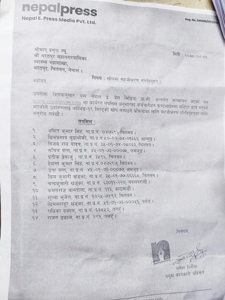 उक्त अनलाइनले आफ्ना कर्मचारीलाई फन्टलाइनमा खटिएर काम गर्नुपर्ने भएकाले कोभिड १९ को खोप उपलब्ध गराइदिन भन्दै भरतपुर महानगरपालिकालाई लेखेको निवेदन भेटिएको छ । उक्त अनलाइनका सिइओ बताउने गणेश निरौलाद्वारा हस्ताक्षेरित उक्त सिफारिस पत्रमा १४ जना पत्रकार तथा कर्मचारीको नाम छ ।