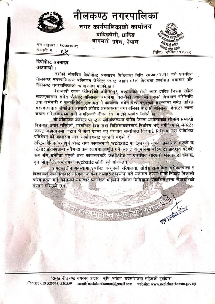 धादिङ, १६ साउन । अक्सिजन जेनेरेटर जडानको विषयमा समाचार प्रकाशित भएपछि नीलकण्ठ नगरपालिकाले खण्डन गरेको छ । नगरपालिकाका प्रमुख प्रशासकीय अधिकृत तुल्सीराम पौड्यालले दियोपोस्टमा प्रकाशित समाचारको खण्डन गरेका हुन् ।