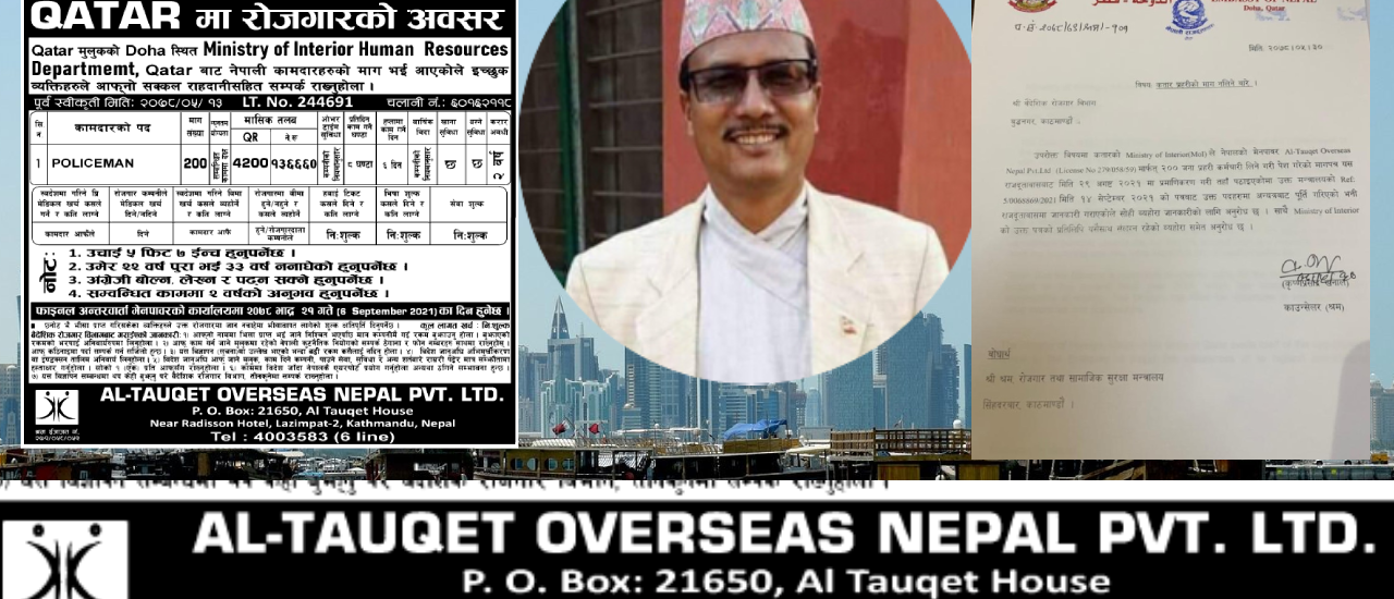 काठमाडौं । कतार प्रहरीमा जागिर लगाइदिने भन्दै गत वर्ष अल ताक्वेत ओभरसिज नामक म्यानपावर कम्पनिले प्रतिव्यक्ति ७ लाख रुपैयाँ ठगी गरेको थियो । तर, अन्तिममा उक्त ठगीको पोल खुलेपछि वैदेशिक रोजगार विभागले कतार प्रहरीको माग नलिने निर्णय गरेको थियो । तरm अल ताक्वेत नामक म्यानपावर कम्पनिले फेरी नेपाली युवालाई कतार प्रहरीमा जागिर लगाइदिन्छु भन्दै प्रति … Continue reading कतार प्रहरीको नाममा फेरी ठगीधन्दा शुरु : प्रति व्यक्ति १५ लाखसम्म असुली !