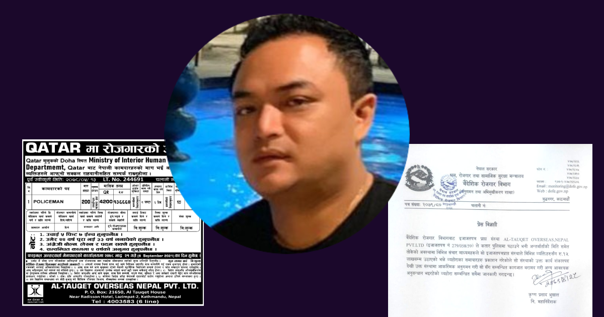 काठमाडौं । कतार प्रहरीको नाममा युवाबाट लाखौँ रुपैयाँ ठगी गरेको आरोपमा वैदेशिक रोजगार विभागले अल ताक्वेत म्यानपावरमा छापा मारेको छ । यसअघि कतार सरकारले रद्द गरिसकेको डेमान्ड फेरी एक पत्रिकामा छपाएर कतार प्रहरीमा जागिर लगाइदिन्छु भन्दै प्रति व्यक्ति १५ लाख रुपैयाँसम्म उठाएको विषयमा दियोपोस्ट डटकमले खबर लेखेको थियो ।
