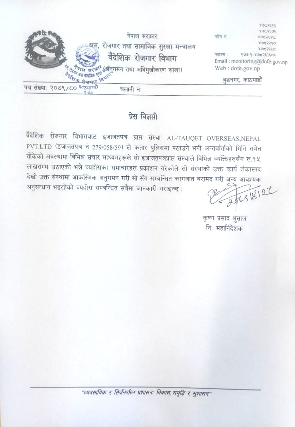 खबर प्रकाशित भएपछि विभागले आजै छापा मारेको हो । विभागका निमित्त महानिर्देशक कृष्ण प्रसाद भुषालले आज छापा मारी महत्वपूर्ण कागजात नियन्त्रणमा लिएको हो ।