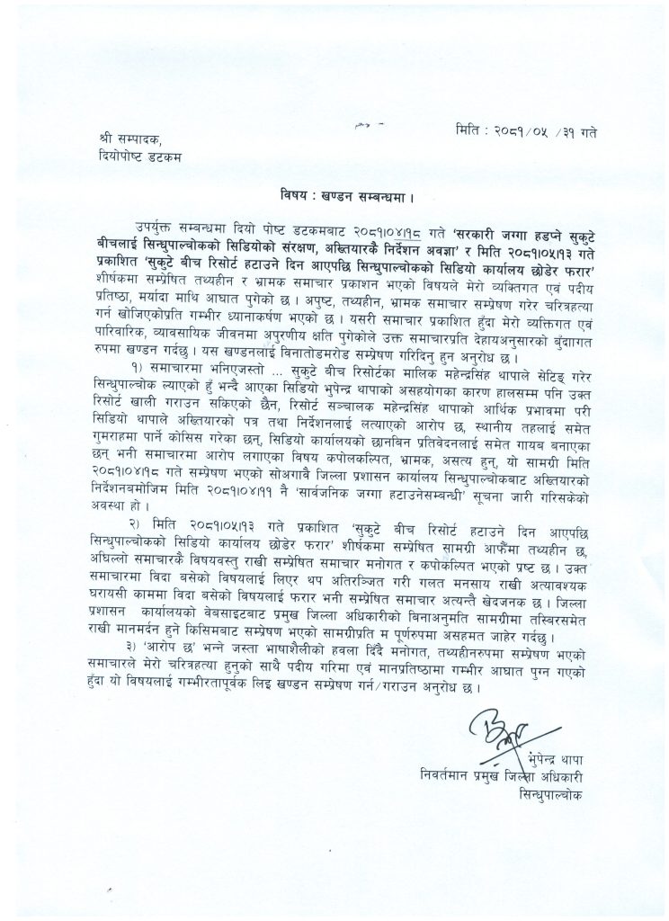 सिन्धुपाल्चोक जिल्ला प्रशासन कार्यालयका तत्कालिन प्रमुख जिल्ला अधिकारी भूपेन्द्र थापाले दियोपोस्टमा प्रकाशित समाचारको खण्डन गरेका छन् । उनले आफ्नो विषयमा प्रकाशित समाचार झूटो र तथ्यहिन भएको आरोप लगाएका छन् ।