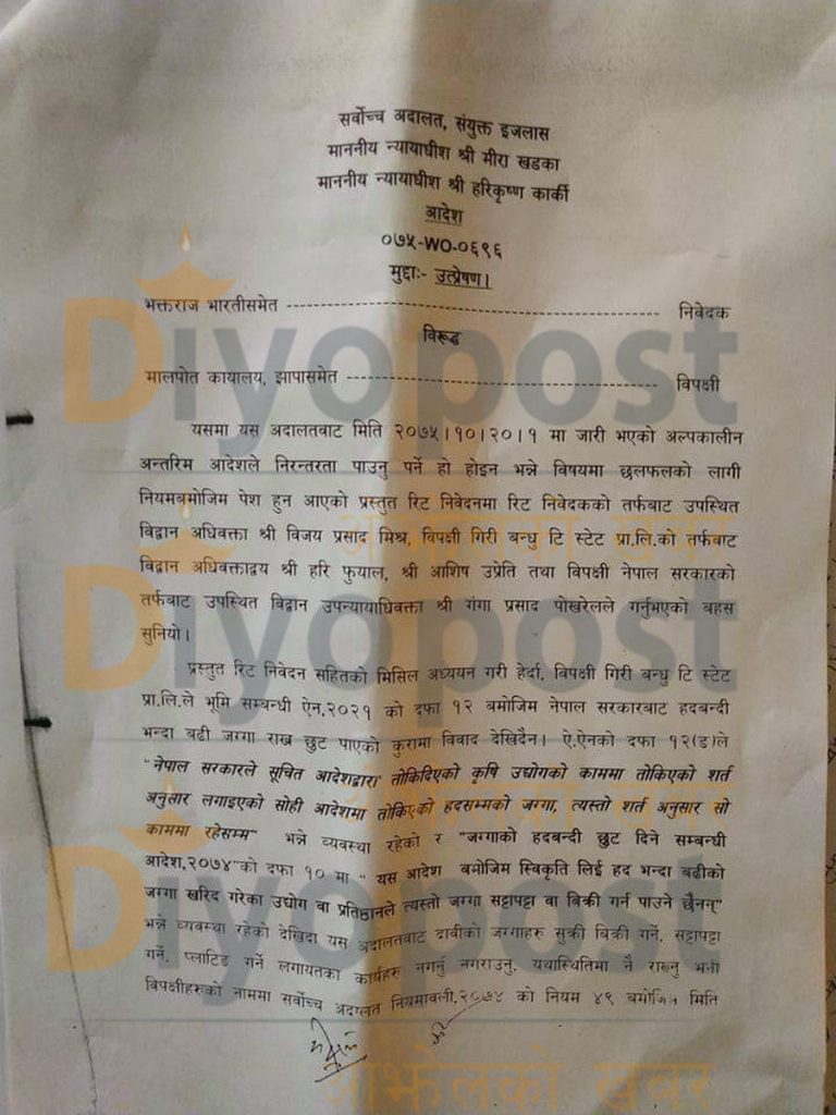 उनले दायर गरेको रिटमा सुनुवाई गर्दै न्यायधीशहरु मीरा खड्का र हरिकृष्ण कार्कीको संयुक्त ईजलाशले हदबन्दीभन्दा बढीको जग्गा खरिद गरेको उद्योग प्रतिष्ठानले त्यस्तो जग्गाहरु सुक्री गर्न, सट्टा पट्टा गर्ने, प्लटिङ गर्ने कार्य लगायत नगर्नु नगराउनु र यथास्थितिमै राख्नु भन्ने आदेश दिएको थियो । तर, उक्त आदेशलाई समेत लत्याउँदै ओली सरकारले ऐन नै संशोधन गरेर सरकारको ३४१ विघा जग्गा भूमाफियालाई बुझाएको हो ।