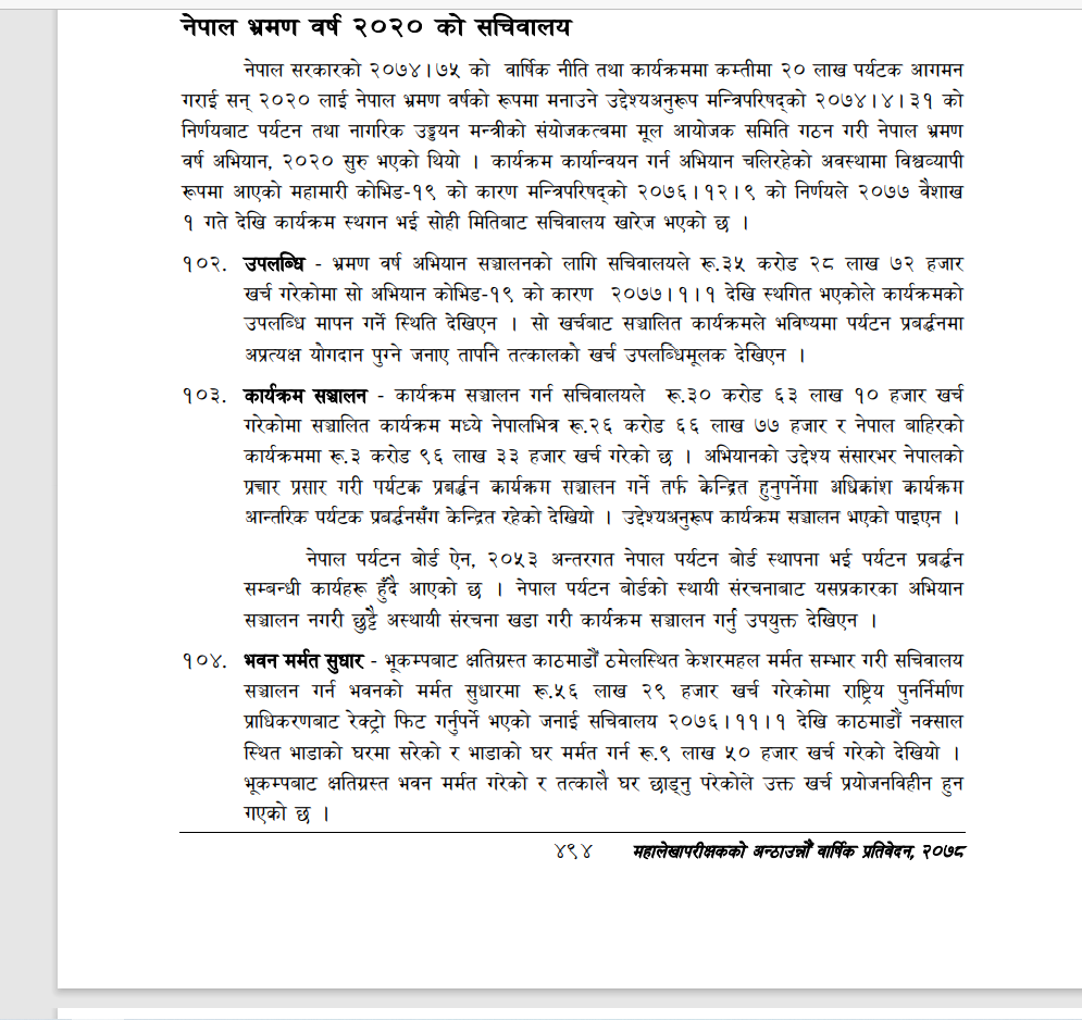 कोरोना महामारीबीच शुरु भएको भ्रमण वर्षको नाममा सरकारी ढुकुटीको भने दोहन भएको पाइएको छ । भ्रमण वर्षको पदाधिकारीहरुले सरकारी ढुकुटीबाट ३० करोडभन्दा बढी रकम खर्च गरेको पाइएको छ ।