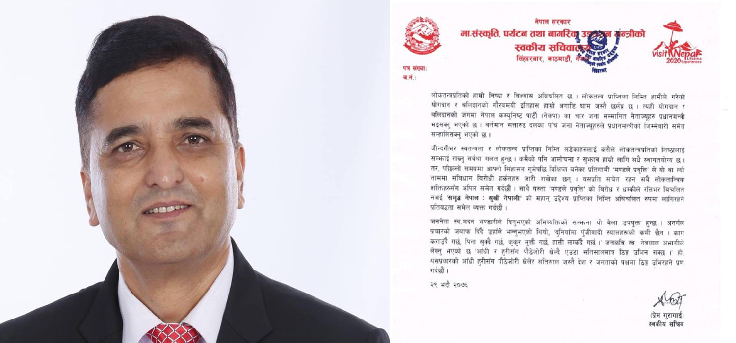 काठमाडौँ, भदौ २९ । शनिबार साँझ नेपालगंज विमानस्थलमा भएको घटनामा संस्कृती, पर्यटन तथा नागरिक उड्डयन मन्त्रालयले गम्भिर ध्यानाकर्षण भएको जनाएको छ । विमानस्थलमा मन्त्री योगेश भट्टराईमाथि भएको दुव्र्यवहार र त्यसपछिका घटनाहरुको सम्वन्धनमा मन्त्रालयको गम्भिर ध्यानाकर्षण भएको उल्लेख गर्दै आइतबार साँझ मन्त्री भट्टराईको सचिवालयले विज्ञप्ती जारि गरेको हो ।