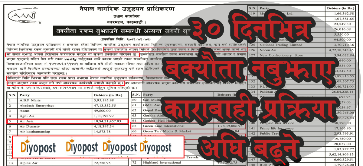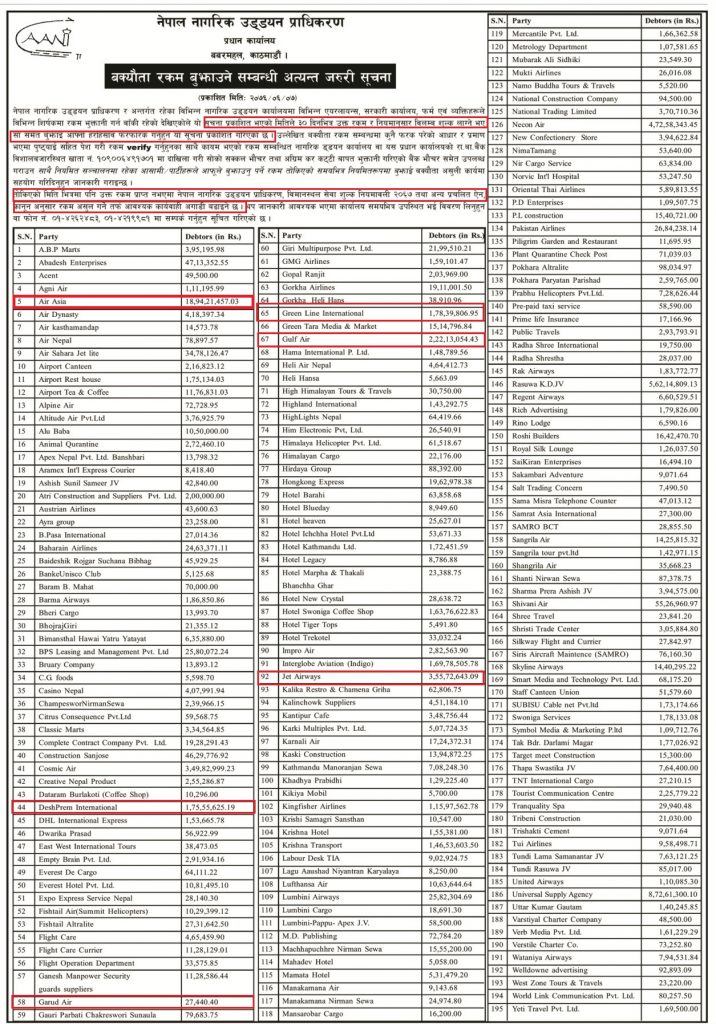 विभिन्न एयरलाईन्स, सरकारी कार्यलय, फर्म एवं व्यक्तिहरुको नाममा सुचना जारी गर्दै प्राधिकरणले एक महिनाभित्र बक्यौता रकम बुझाउन आग्रह गरेको हो । प्राधिकरणले उल्लेख गरेको बक्यौता रकममा कुनै फरक परेको भए प्रमाण सहित उपस्थित हुन पनि आग्रह गरिएको छ ।