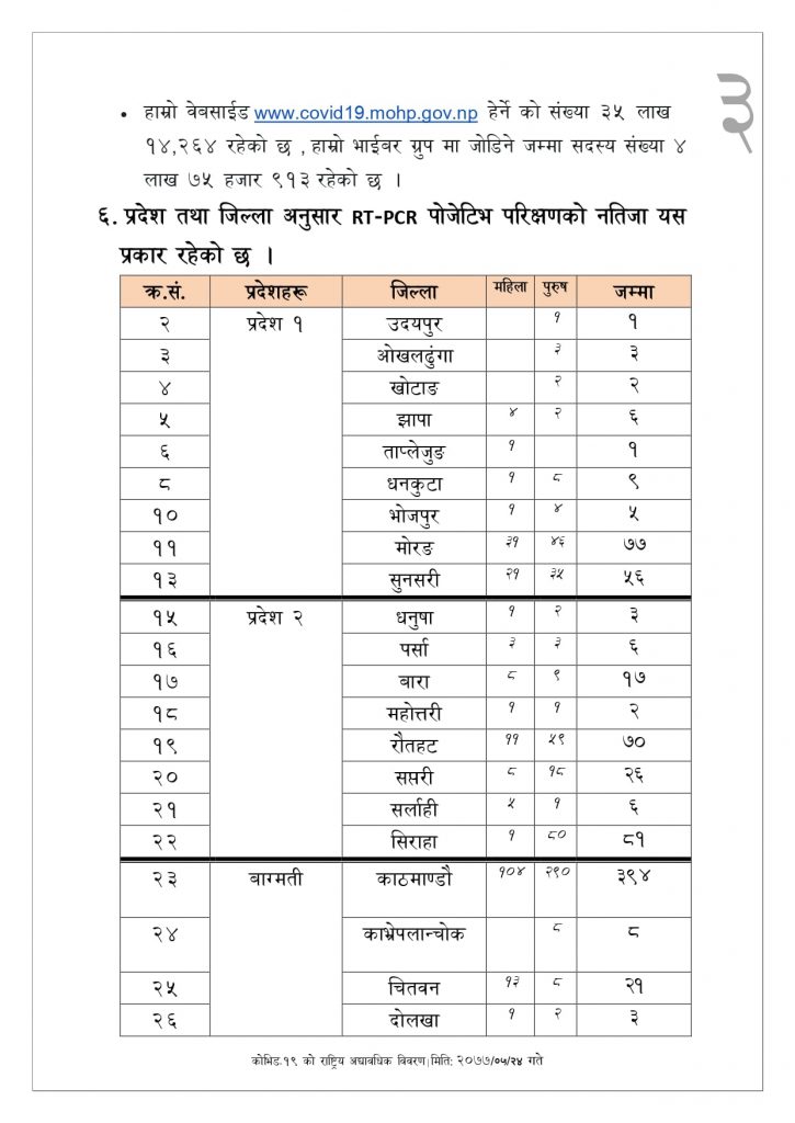 पछिल्लो २४ घण्टामा ११ हजार १ सय ६७ जनाको पीसीआर परीक्षण गरिएको छ। हाल देशभर सक्रिय संक्रमितको संख्या १५ हजार २५ रहेको छ।