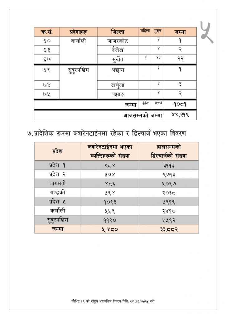 काठमाडौँ– नेपालमा पछिल्लो २४ घण्टामा थप १ हजार ८१ जनामा कोरोना भाइरसको संक्रमण पुष्टि भएको छ। यससँगै नेपालमा कोरोना संक्रमितको कुल संख्या ४९ हजार २ सय १९ पुगेको छ।