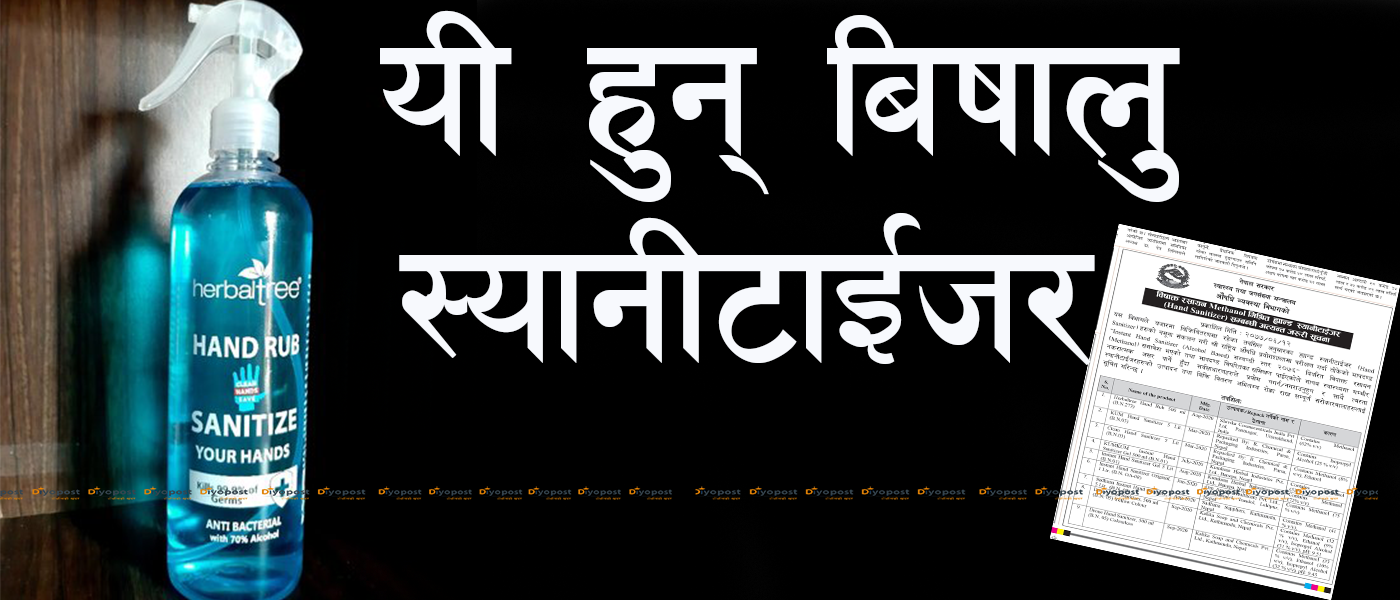 औाषधी व्यवस्था विभागले नै हातमा लगाउने ह्याण्ड स्यानीटाईजर प्रयोगमा ध्यान दिन पटक पटक सुचना जारी गरेको छ । खासगरी यस्ता स्यानीटाइजरमा प्रयोग हुने विसाक्त रसायनका कारण मानव स्वास्थ्यमा नकरात्मक असर पर्ने भन्दै विभागले त्यस्ता वस्तु प्रयोगमा रोक लगाएको छ ।