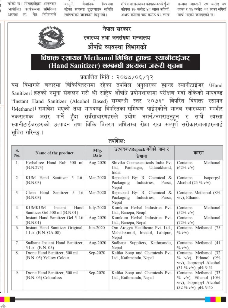 विभागका अनुसार बजारमा विक्री वितरण भईरहेका ती ह्याण्ड स्यानीटाईजरहरुको नमुना संकलन गरि औषधि प्रयोगशालामा परिक्षण गर्दा तोकिएको स्तर विपरित बिसाक्त बस्तु समावेश गरिएको पाइएको हो । यसले मानव स्वास्थ्यमा असर गर्ने भन्दै त्यस्ता वस्तु र्वसाधरणको पहुँचमा नराख्न विभागले ध्यानाकर्षण गराएको छ ।