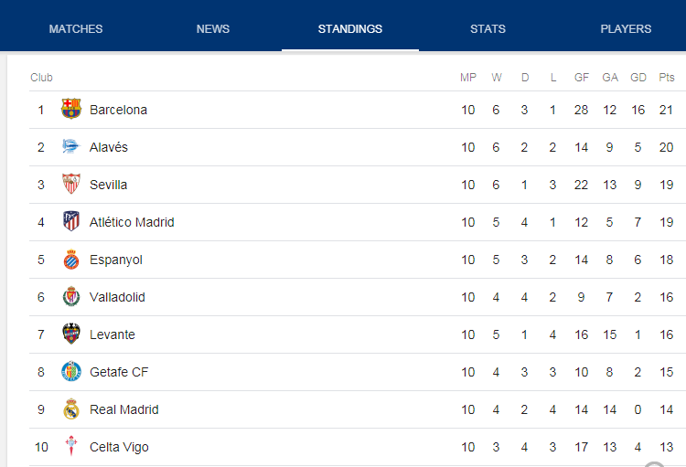 दोस्रो स्थानमाअलाभेस, तेस्रोमा सेभिल्ला, चौथोमाएथलेटिको म्याड्रिड, चौथोमा स्मानियोल, पाँचौमा भालाडोलिड, सातौमा डेभान्टे, आठौंमा गेटाफेपछि रियल नवौं स्थानमा छ । १० मध्ये रियलले चार जितचार हार दुईमा बराबरीको नतिजानिकालेको छ । पछिल्ला खेलमासेभिल्लासँग ३–०, एथलेटिको म्याड्रिडसँग गोलरहित बराबरी, अलाभेसँग एक शुन्यको पराजय, लेभान्टेसँग २–१ को पराजयपछि बार्सिलोनासँग ५–१ गोलको पराजय बेहोरेर खराब लयबाट गुज्रेको हो ।