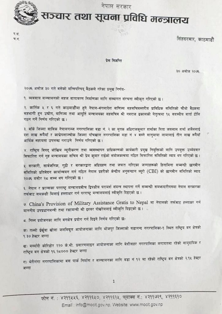 यस्ता छन मन्त्रीपरिषद वैठकका निर्णयहरु