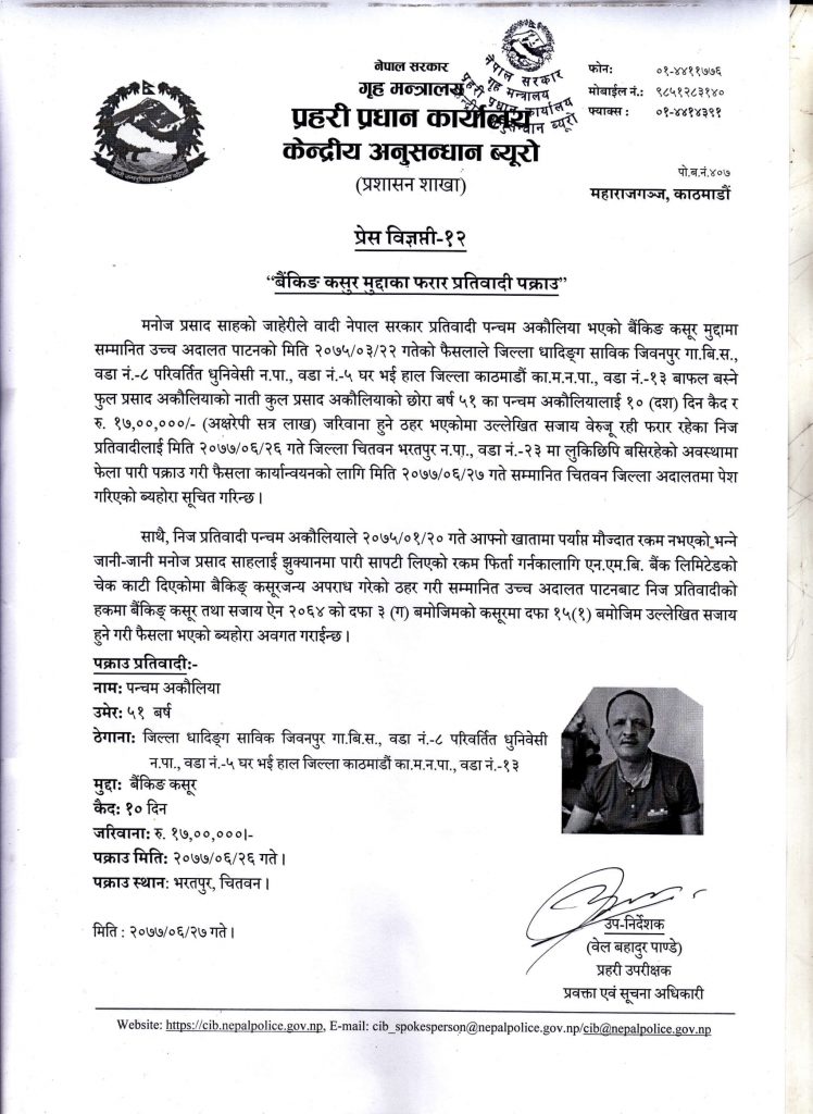 काठमाडौं, प्रहरी अनुसन्धान केन्द्रीय ब्युरो सिआइबीले बैंकिङ कसुर मुद्दामा फरार रहेका एक अभियुक्तलाई पक्राउ गरेको छ ।