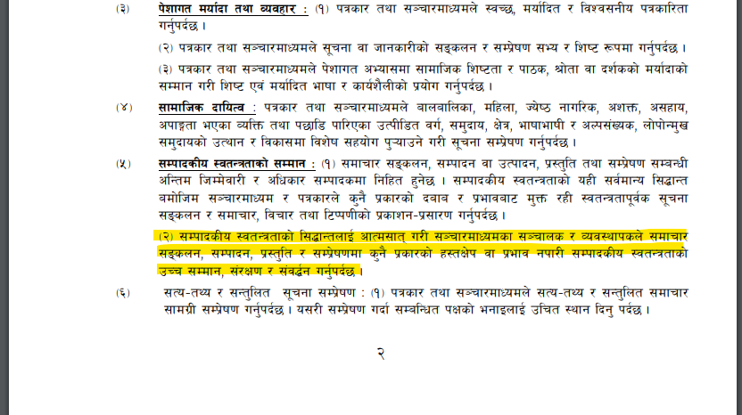 सम्पादन, प्रस्तुती र सम्प्रेषणमा कुनै प्रकारको हस्तक्षेप वा प्रभाव नपारी सम्पादकीय स्वतन्त्रताको सम्मान र संरक्षण र सम्वद्र्धन गर्नुपर्दछ ।’