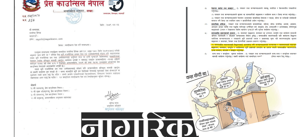 काठमाडौं । प्रेस काउन्सिल नेपालले सञ्चारकर्मीमाथि राजतन्त्रकालिन सेन्सरसिपको झल्को दिनेगरि पत्राचार गर्न थालेको छ । नेकपा एमालेका अध्यक्ष तथा पूर्व प्रधानमन्त्री केपी शर्मा ओलीलाई व्यङ्ग्य गर्दै कार्टुन बनाएको भन्दै एक कार्टुनलाई लिएर २४ घण्टे स्पष्टिकरण सोधेर काउन्सिलले अभिव्यक्ति स्वतन्त्रतामाथि प्रहार गरेको हो । नागरिक दैनिकमा कार्यरत कार्टुनिस्ट रविन सायमीले ‘ओली बा’ शिर्षकमा कोरेको कार्टुन प्रकाशित … Continue reading केपी ओलीबारे कार्टुन छाप्दा सञ्चार माध्यममाथि प्रेस काउन्सिलको ‘राजतन्त्रकालिन सेन्सरसिप’ !