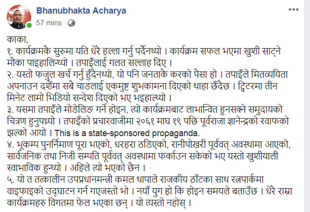 मिडिया कन्टेन्टलाई नजिकबाट पछ्याइरहेका भानुभक्त आचार्यले कार्यक्रम सफल भएपछि खुशी साट्ने मौका पाइने भन्दै प्रधानमन्त्रीलाई गलत सल्लाह दिइएको लेखेका छन् । जनताको करमा फजुल खर्च गरेर पूर्व राजा ज्ञानेन्द्रको झल्को दिएको भन्दै उनले राज्यको लगानीमा भएको प्रापोगान्डा भनेका छन् । सबै दैनिक पत्रिकाहरुको फोटोसमेत उनले फेसबुकका पोस्ट गर्दै नतिजा दिएको भए प्रचारमा यसरी रमाउनै पर्ने थिएन भन्दै सरकारलाई सचेत गराएका छन् ।