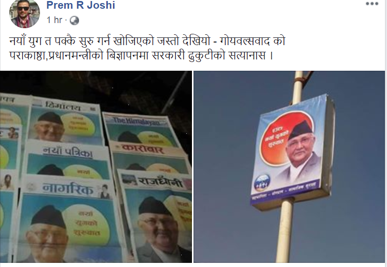 यी विज्ञापन छापिएका संचारमाध्यममा काम गर्ने पत्रकारहरुले समेत सरकारको यो शैलीको विरोध गरेका छन् । राजधानीका पोलपोलमा प्रधानमन्त्रीका सन्देश लेखेका बोर्ड झुण्ड्याइएको, अनावश्यक विज्ञापन गरेको भन्दै आफ्नै माध्यममा छापिएका विज्ञापनप्रति पत्रकारहरुले नै सांकेतिक विरोध जनाएका हुन् ।