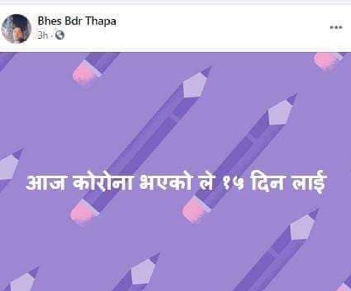पक्राउ पर्नेभएपछि थापाले आफ्नो फेसबुकमा ‘आफुलाई कोरोना भएकोमा १५ दिनलाई’ भनेर पोष्ट समेत गरेका थिए ।