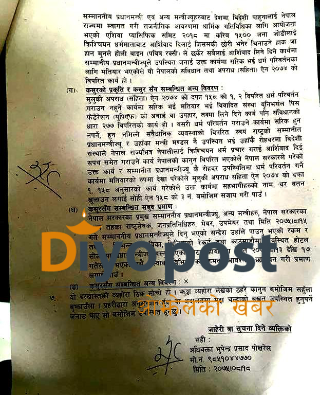 प्रधानमन्त्री ओली र एशिया प्यासेफिक समिट आयोजक संस्थाका प्रमुख एकनाथ ढकाल विरुद्ध धर्म परिवर्चन गराएको आरोपमा मुद्दा दायर गर्न अधिवक्ता पोखरेल आइतबार मध्यान्न सरकारी वकिलको कार्यालयमा पुगेका थिए ।