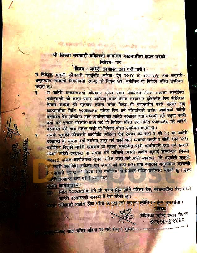 अधिवक्ता भूपेन्द्र पोखरेलले यसअघि काठमाडौं प्रहरी परिसर टेकुमा जाहेरी लिएर गएका थिए तर, प्रहरीले जाहेरी नलिएपछि उनी सरकारी वकिलको कार्यालय बबरमहल पुगेका थिए ।