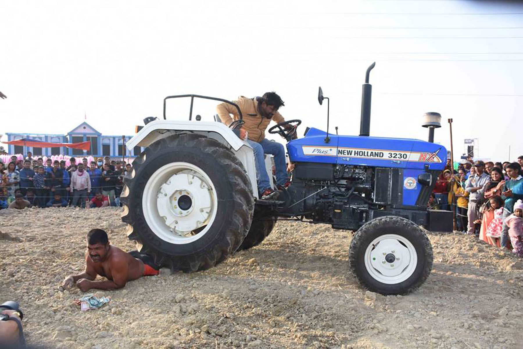भैरहवा , मंसिर २६ । भैरहवामा जारी सातौ लुम्बिनी राष्ट्रिय महोत्सवमा भईरहेको कुस्ती प्रतियोगितामा आफ्नो शरीरमाथी ट्याक्टर चढाएर साहशीक खेल प्रदर्शन गर्दै पन्जाब भारतबाट आएका अली पहलमान ।