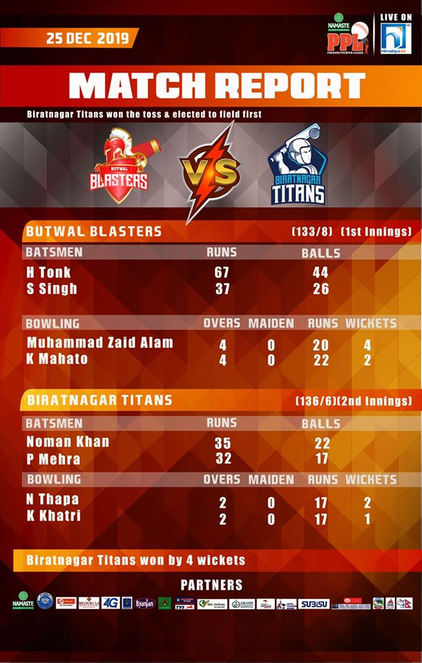 लिग चरणको अन्तिम खेलमा बुटवल ब्लास्टर्सले दिएको १३४ रनको लक्ष्य १२.२ ओभरमा पुरा गरे बिराटनगर इलिमीनेटर खेल्न छनौट हुने समिकरण थियो। बिराटनगरले ११.४ ओभरमा उक्त लक्ष्य पुरा गर्दै इलिमीनेटरमा स्थान पक्का गरेको हो। बिराटनगर इलिमीनेटर पुगे संगै अंकतालिकामा चौथो काठमाडौँ गोल्डेन वारियर्सको इलिमीनेटर पुग्ने आशा समाप्त भएको छ।