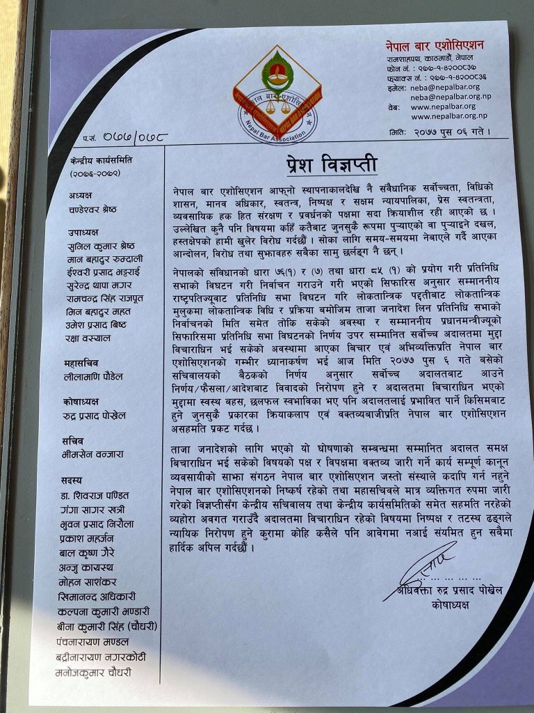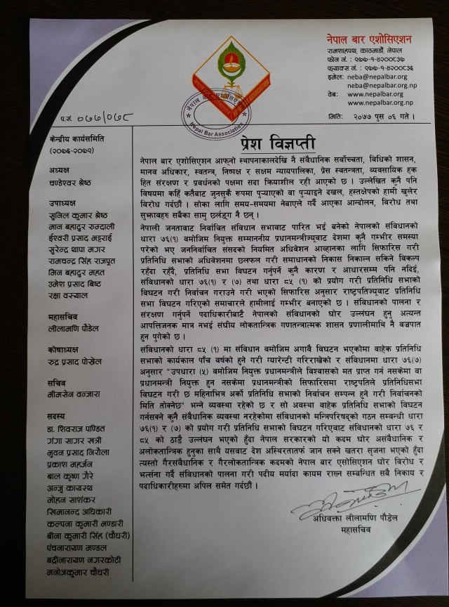 संसद विघटनको विरोधमा बार एशोसिएशनका महासचिव अधिवक्ता लिलामणि पौडेलले विज्ञप्ति जारी गरेका थिए । बारको विधान अनुसार महासचिवले मात्रै विज्ञप्ति जारी गर्न पाउने व्यवस्था छ ।