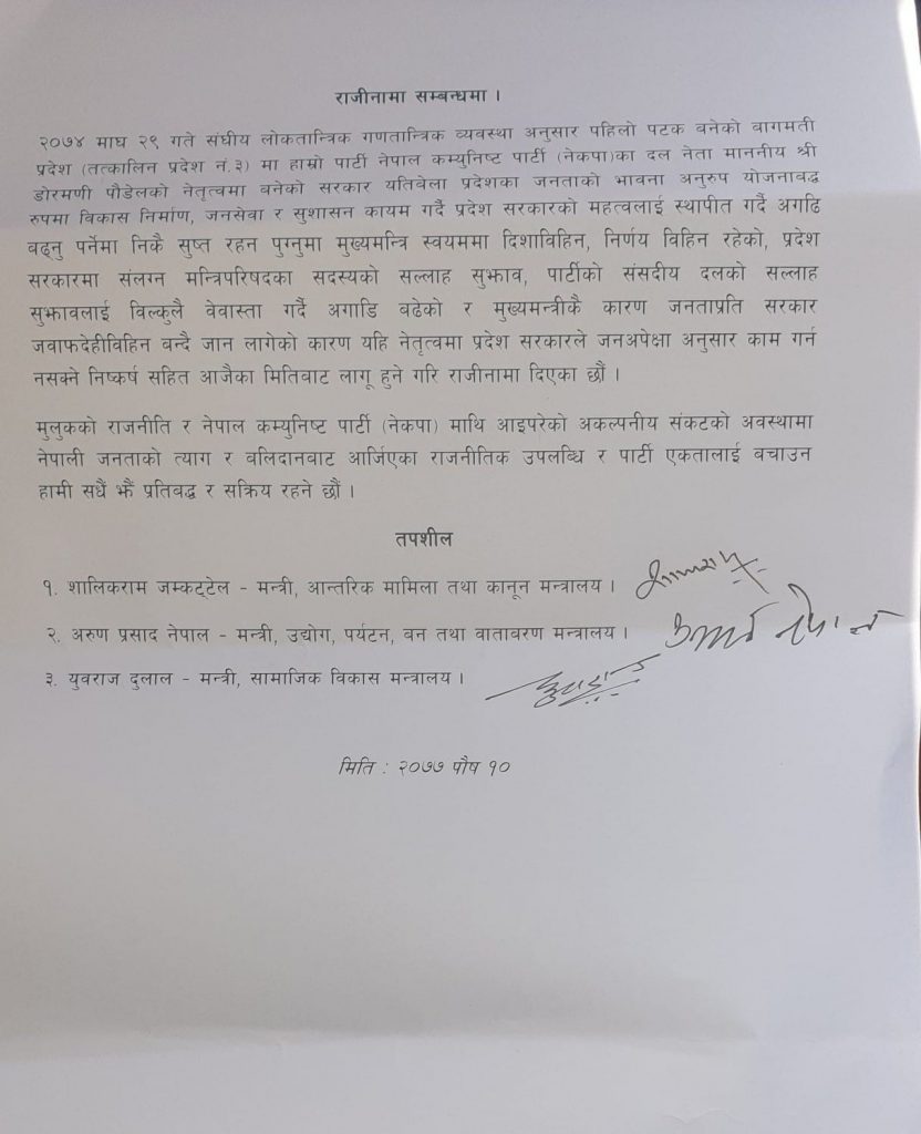 वागतमति प्रदेशका नेकपाका संसदीय दलका उपनेता तथा आन्तरिक मामिला तथा कानुन मन्त्री शालिकराम जम्मकट्टेल, सामाजिक विकास मन्त्री युवराज दुलाल शरद र उद्योग, पर्यटन वन तथा वातावरण मन्त्री अरुण प्रसाद नेपालले पदबाट राजिनामा दिएका हुन् ।